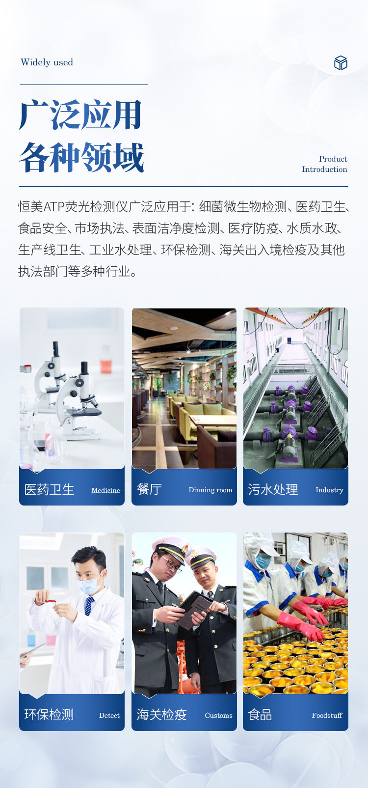 恒美ATP檢測儀廣泛應(yīng)用于:細(xì)菌微生物檢測、醫(yī)藥衛(wèi)生、食品安全、市場執(zhí)法、表面潔凈度檢測、醫(yī)療防疫、水質(zhì)水政、生產(chǎn)線衛(wèi)生、工業(yè)水處理、環(huán)保檢測、海關(guān)出入境檢疫及其他執(zhí)法部門等多種行業(yè)。