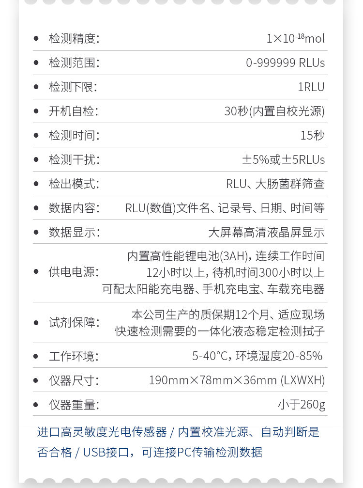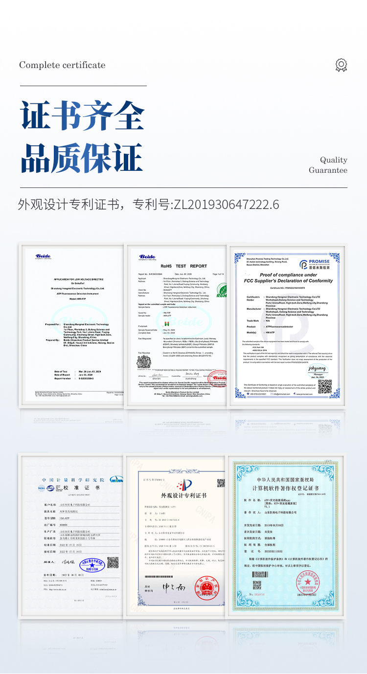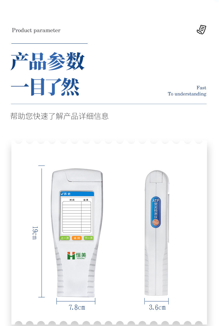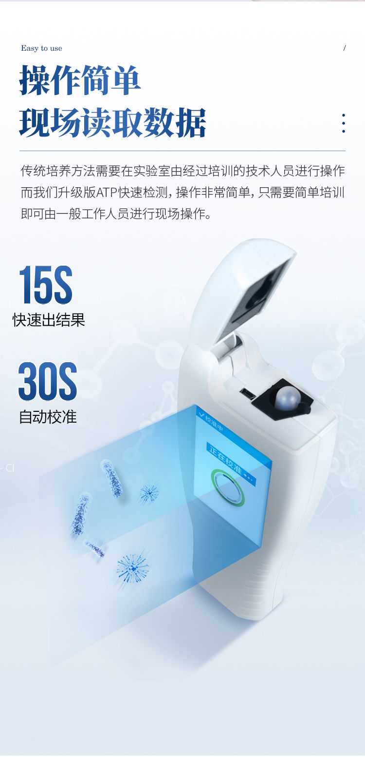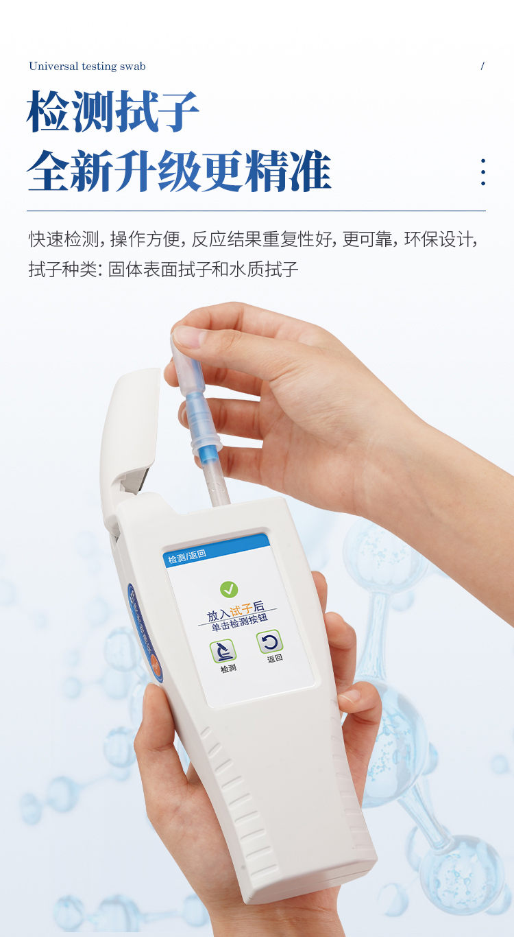 該設(shè)備為全新升級產(chǎn)品,大屏幕觸摸顯示屏,代替?zhèn)鹘y(tǒng)按鍵。操作采用生物化學(xué)反應(yīng)方法檢測ATP含量,ATP檢測儀基于螢火蟲發(fā)光原理,利用“熒光素酶—熒光素體系”快速檢測三磷酸腺苷(ATP)。ATP拭子含有可以裂解細(xì)胞膜的試劑,能將細(xì)胞內(nèi)ATP釋放出來,與試劑中含有的特異性酶發(fā)生反應(yīng),產(chǎn)生光,再用熒光照度計(jì)檢測發(fā)光值,微生物的數(shù)量與發(fā)光值成正比,由于所有生物活細(xì)胞中含有恒量的ATP,所以ATP含量可以清晰地表明樣品中微生物與其他生物殘余的多少,用于判斷衛(wèi)生狀況。