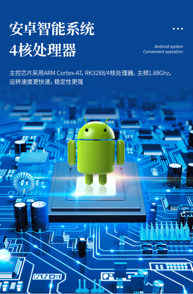 1、主控芯片采用ARM Cortex-A7,RK3288/4核處理器,主頻1.88Ghz,運(yùn)轉(zhuǎn)速度更快速,穩(wěn)定性更強(qiáng)。