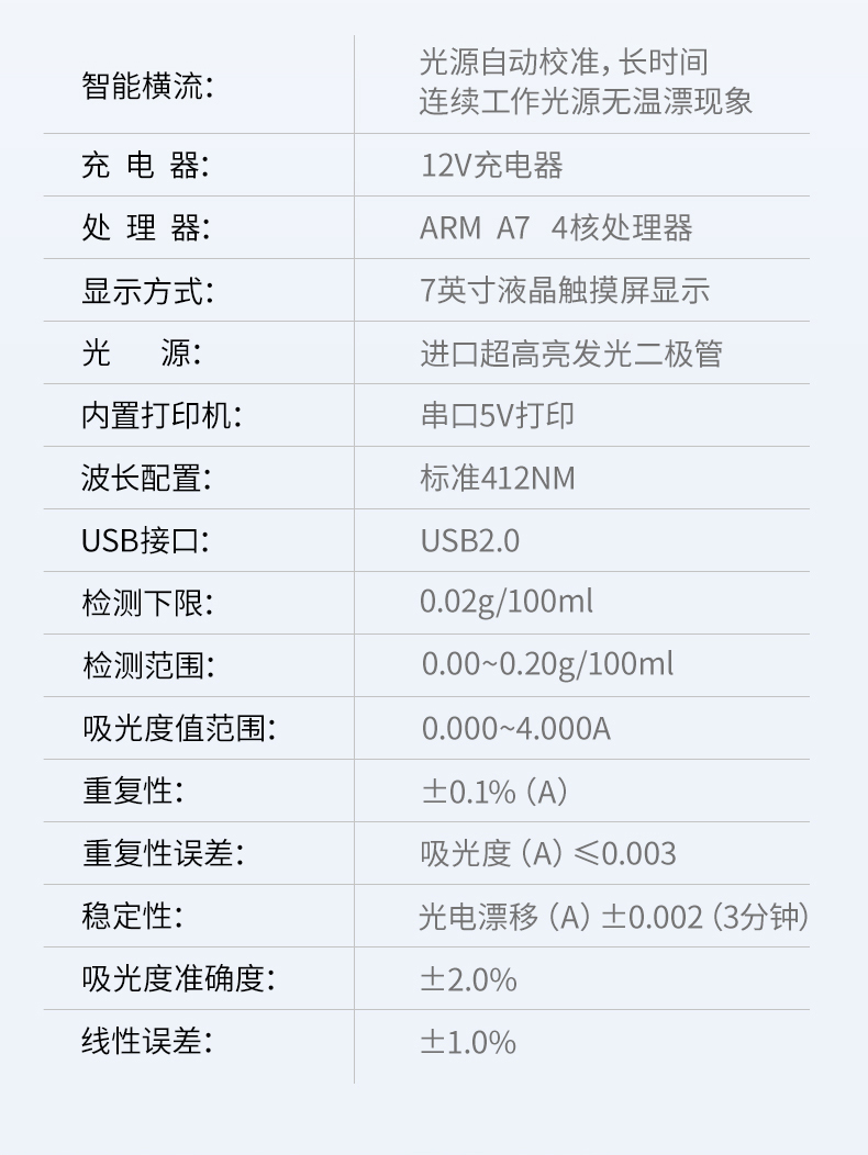 7、吸光度準(zhǔn)確度:±2.0%