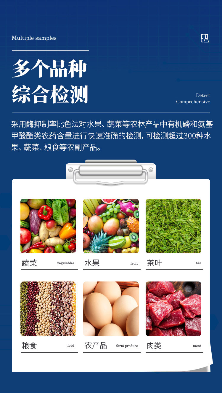 廣泛應用于主要用于蔬菜、水果、茶葉、糧食、農(nóng)副產(chǎn)品等食品中有機磷和氨基甲酸酯類農(nóng)藥殘留的快速檢測;此外還可用于果蔬茶生產(chǎn)基地和農(nóng)貿(mào)批發(fā)銷售市場現(xiàn)場檢測,餐館、學校、食堂、家庭果蔬加工前的安全速測等。