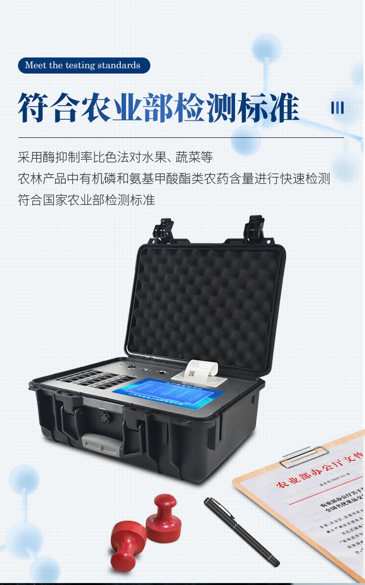 檢測標準:依據(jù)國家標準方法(GB/T5009.199-2003)以及世界衛(wèi)生組織WHO、世界糧農(nóng)組織FAO殘留農(nóng)藥檢測標準、世界環(huán)境保護局EPA參照攝入量等要求來設計。采用酶抑制率比色法對水果、蔬菜等農(nóng)林產(chǎn)品中有機磷和氨基甲酸酯類農(nóng)藥含量進行快速準確的檢測,乙酰膽堿酯酶和丁酰膽堿酯酶試劑均可以使用,符合國家標準和農(nóng)業(yè)部標準的要求。