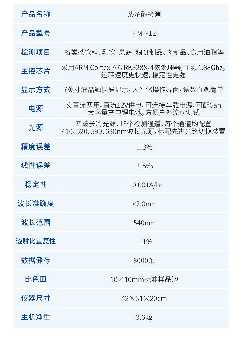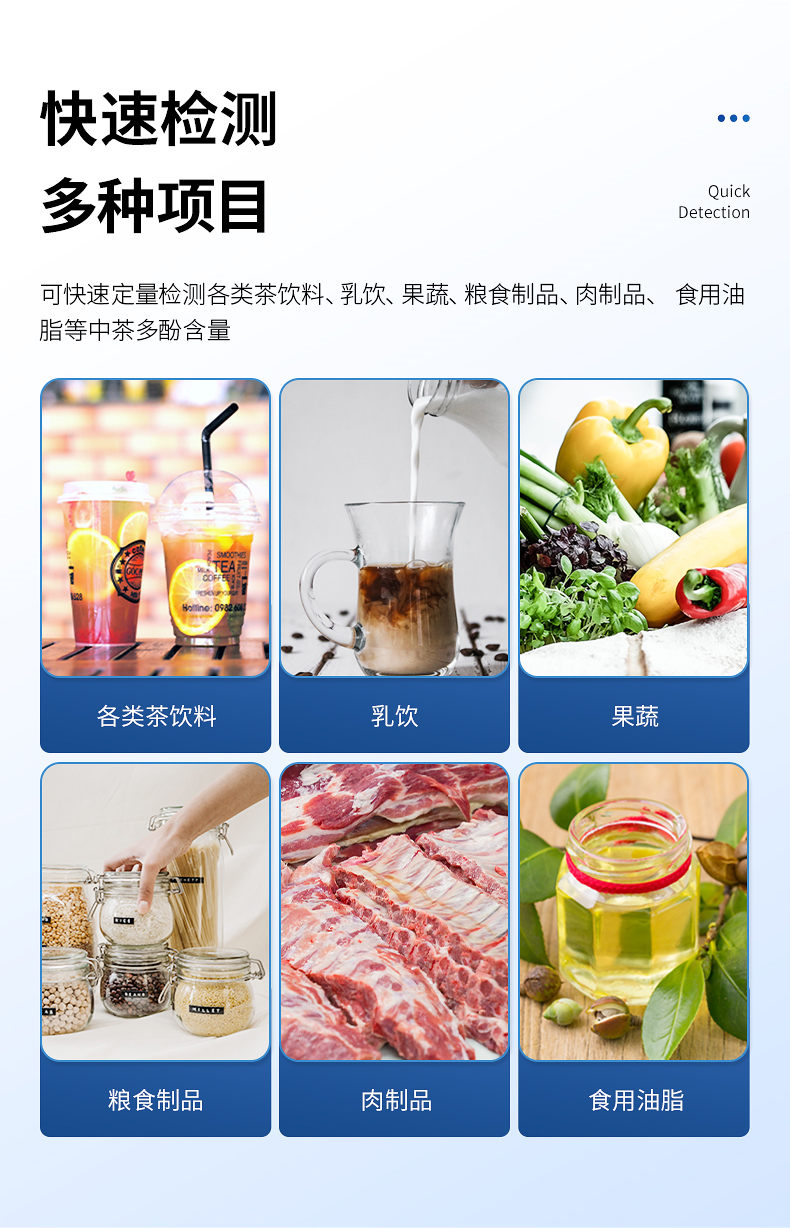 HM-F12茶多酚檢測儀可快速定量檢測各類茶飲料、乳飲、果蔬、糧食制品、肉制品、食用油脂等中茶多酚含量。茶多酚檢測儀可以廣泛應用于產(chǎn)品質量監(jiān)督檢驗、工商管理、茶葉批發(fā)市場、茶葉0.深加工基地、飲料企業(yè)、超市、商場、各大食品安全監(jiān)測系統(tǒng)等部門。