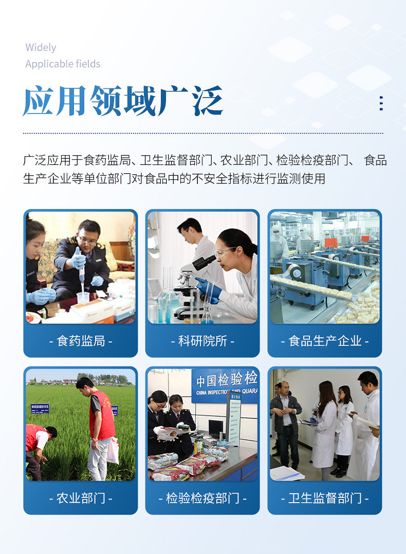 該儀器廣泛應(yīng)用于食藥監(jiān)局、衛(wèi)生監(jiān)督部門、農(nóng)業(yè)部門、檢驗(yàn)檢疫部門、食品生產(chǎn)企業(yè)等單位部門對(duì)食品中的不安全指標(biāo)進(jìn)行監(jiān)測(cè)使用。