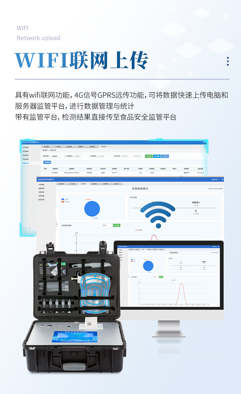 4、儀器帶有監(jiān)管平臺(tái),數(shù)據(jù)可局域網(wǎng)和互聯(lián)網(wǎng)數(shù)據(jù)上傳,檢測(cè)結(jié)果直接傳至食品安全監(jiān)管平臺(tái)。進(jìn)行區(qū)域食品安全監(jiān)管及大數(shù)據(jù)分析處理與數(shù)據(jù)統(tǒng)計(jì),檢測(cè)區(qū)域食品安全長短期動(dòng)態(tài),達(dá)到食品安全問題預(yù)估、預(yù)警
