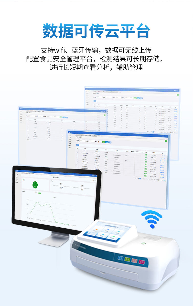 6、配置食品安全管理平臺,檢測結(jié)果可長期存儲,進(jìn)行長短期查看分析,輔助管理。