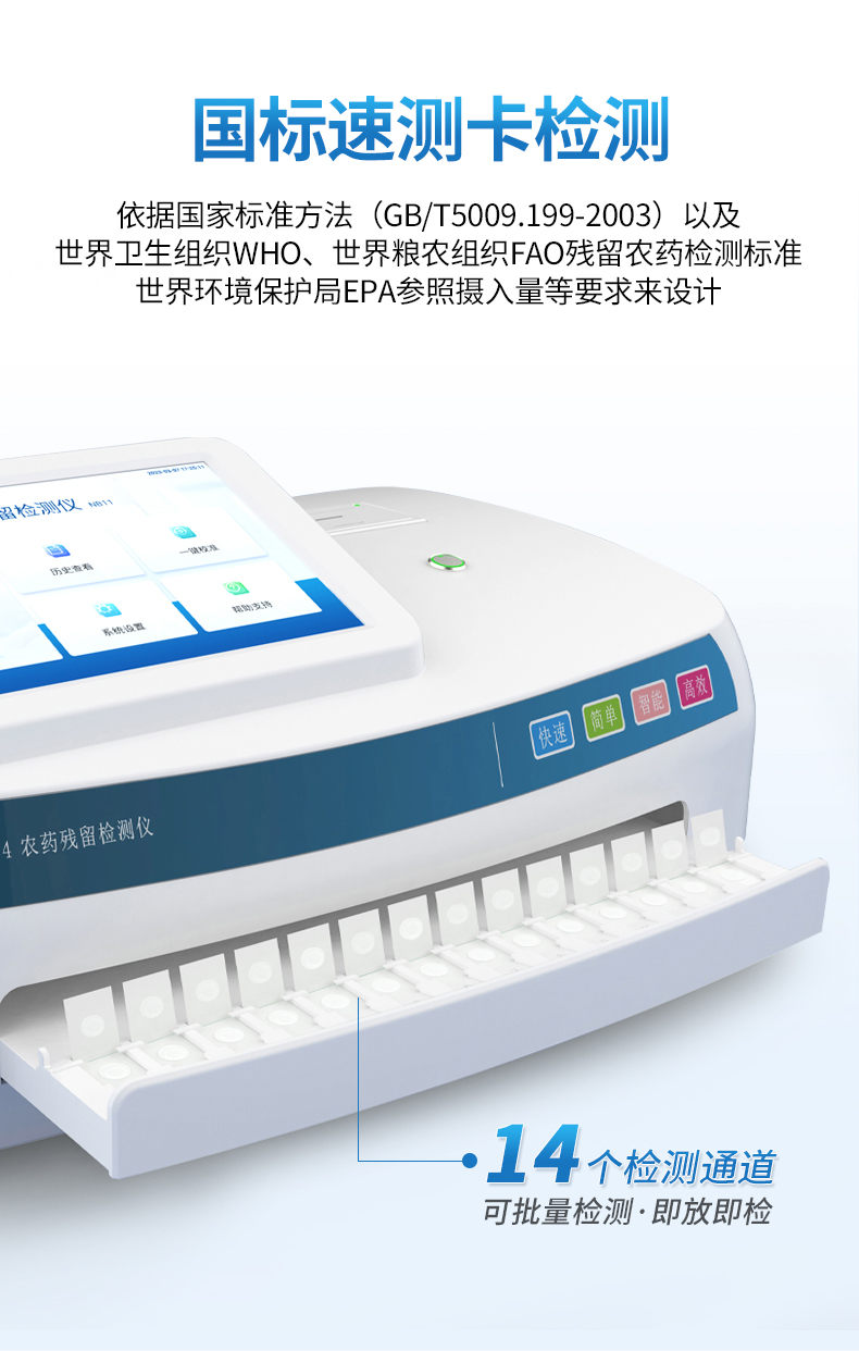 該儀器為恒美科技新研發(fā)一款農(nóng)殘快速檢測儀,采用國標(biāo)速測卡,使檢測速度更快,操作更加簡便。檢測標(biāo)準(zhǔn):依據(jù)國家標(biāo)準(zhǔn)方法(GB/T5009.199-2003)以及世界衛(wèi)生組織WHO、世界糧農(nóng)組織FAO殘留農(nóng)藥檢測標(biāo)準(zhǔn)、世界環(huán)境保護(hù)局EPA參照攝入量等要求來設(shè)計(jì)。