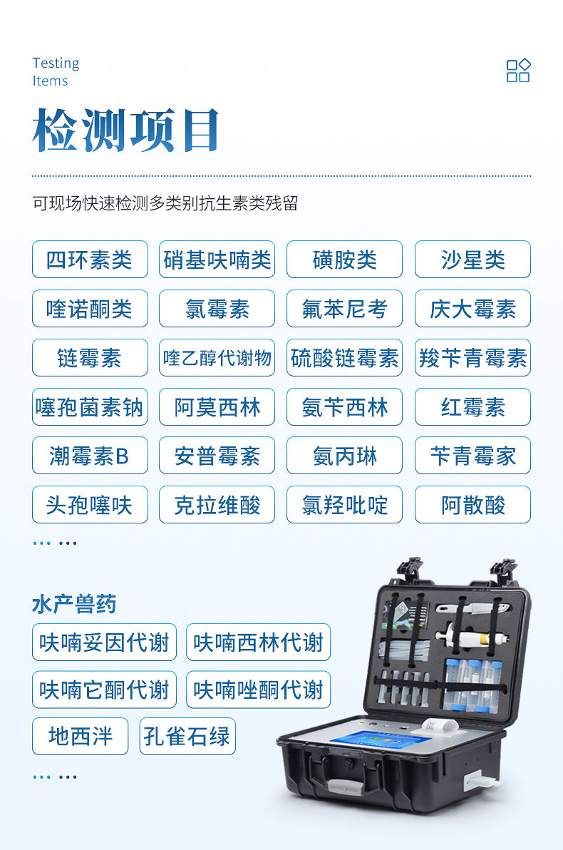 抗生素檢測儀可現(xiàn)場快速檢測抗生素類殘留、獸藥殘留、激素類殘留、毒素類殘留,化學類殘留等多種項目,如可快速檢測四環(huán)素類、硝基呋喃類、磺胺類、沙星類、喹諾酮類、氯霉素、慶大霉素、鏈霉素、喹乙醇代謝物、硫酸鏈霉素、羧芐青霉素、噻孢菌素鈉、阿莫西林、氨芐西林、紅霉素、潮霉素B、安普霉紊、桿菌肽等抗生素快速檢測;還可檢測激素類:鹽酸克倫特羅、沙丁胺醇、萊克多巴胺、己烯雌酚等,水產(chǎn)獸藥:呋喃妥因代謝、呋喃西林代謝、呋喃它酮代謝、呋喃唑酮代謝、孔雀石綠等,毒素類:黃曲酶毒素B1、嘔吐毒素、玉米赤霉烯酮、赭曲霉毒素A等,化學類藥物:氨丙琳、甲基吡啶磷、阿滅丁、雙甲脒、阿散酸、阿維菌素、氮哌酮、芐青霉家、頭孢噻呋、克拉維酸、氯羥吡啶等。