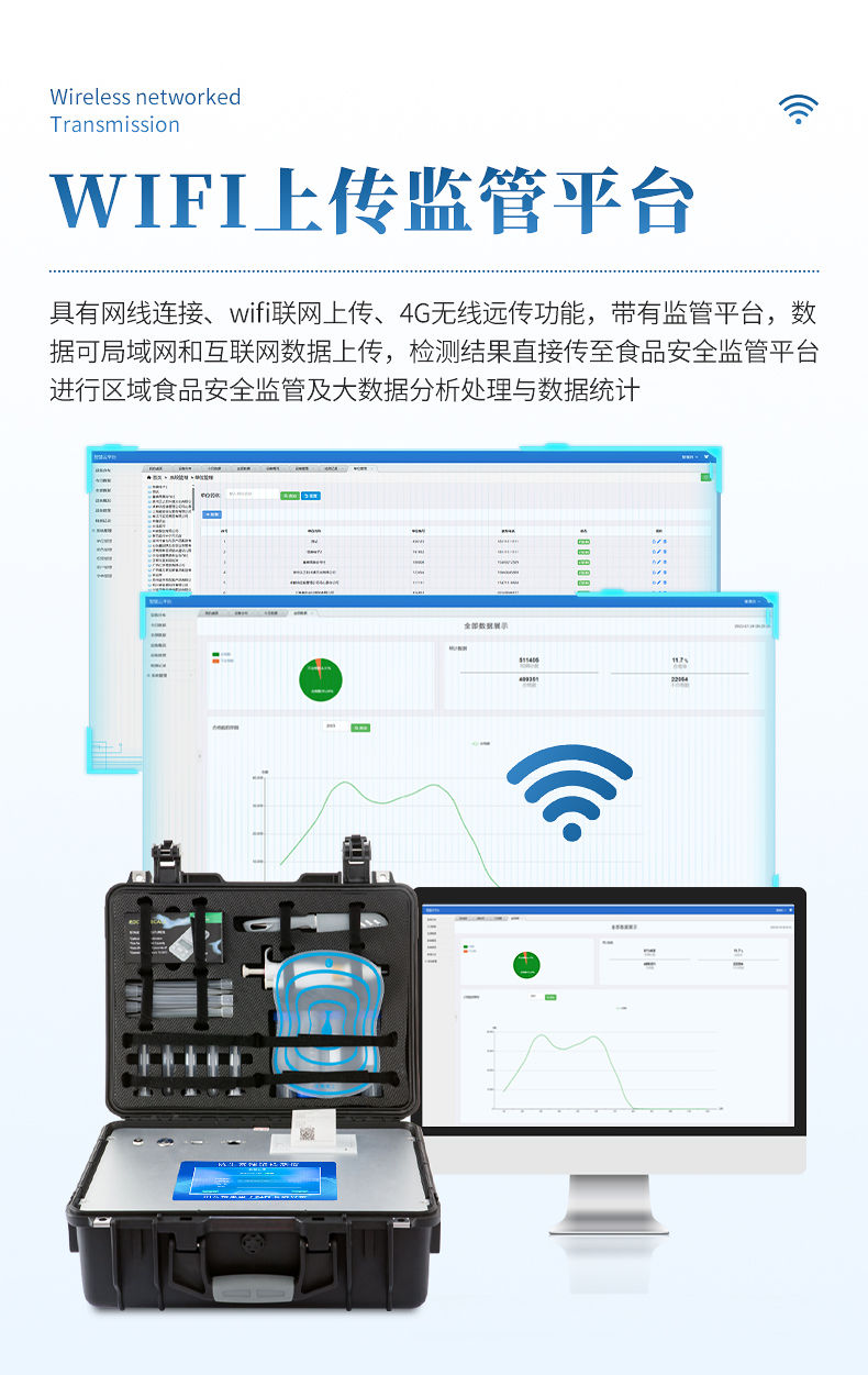 5、儀器帶有監(jiān)管平臺,數(shù)據(jù)可局域網(wǎng)和互聯(lián)網(wǎng)數(shù)據(jù)上傳,檢測結(jié)果直接傳至食品安全監(jiān)管平臺。進行區(qū)域食品安全監(jiān)管及大數(shù)據(jù)分析處理與數(shù)據(jù)統(tǒng)計,檢測區(qū)域食品安全長短期動態(tài),達到食品安全問題預(yù)估、預(yù)警