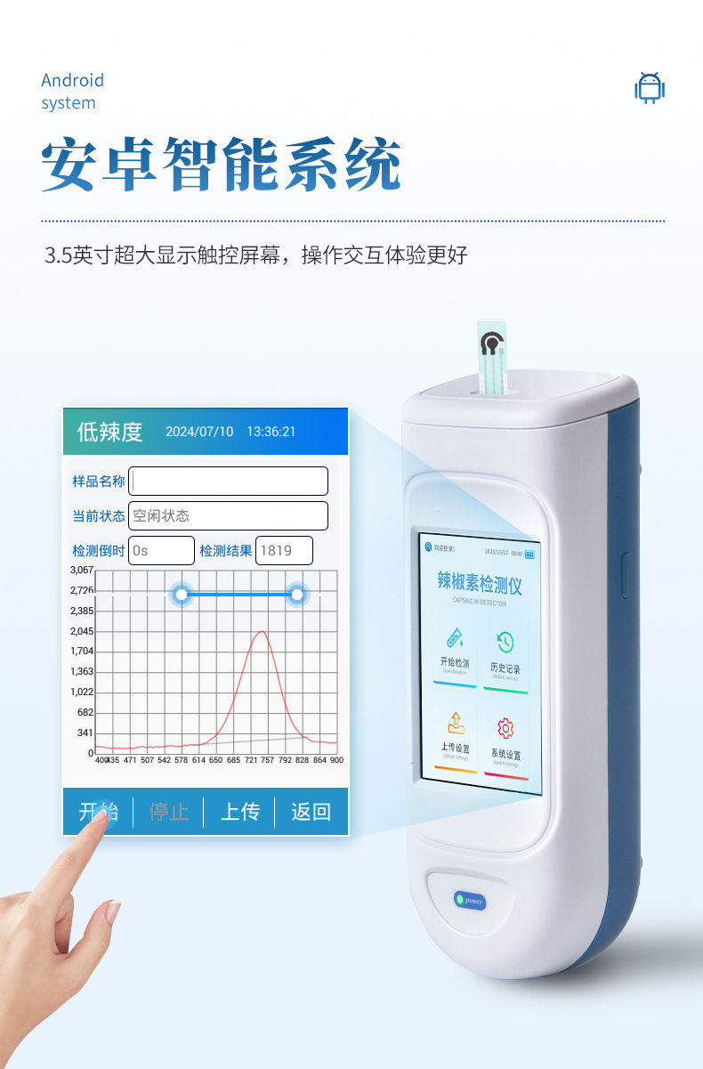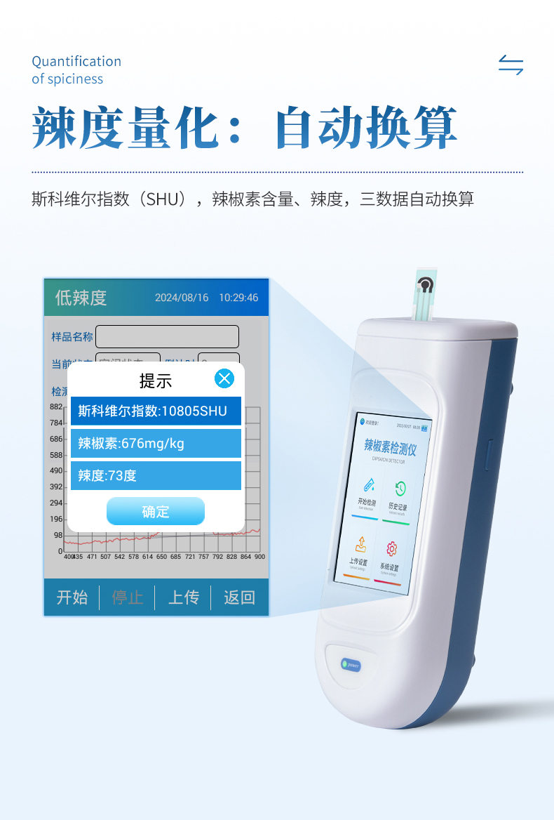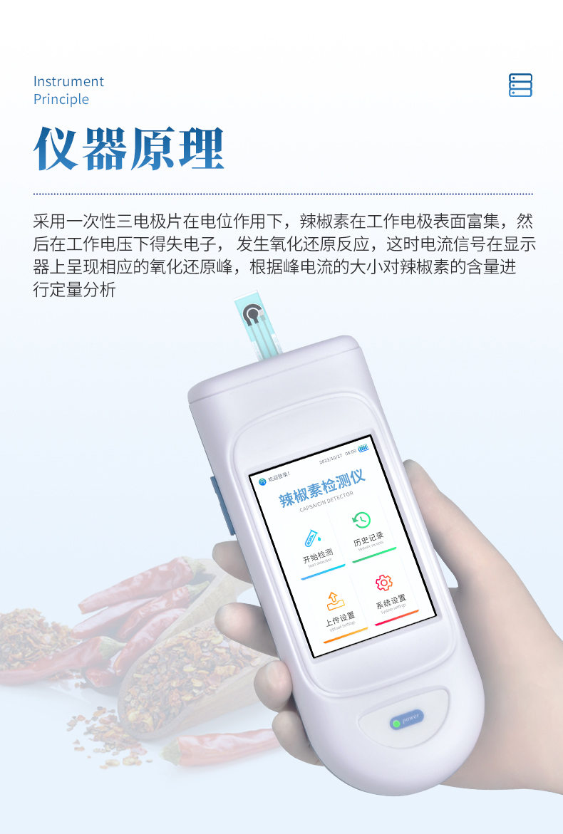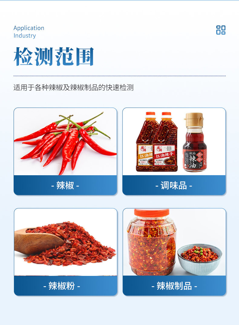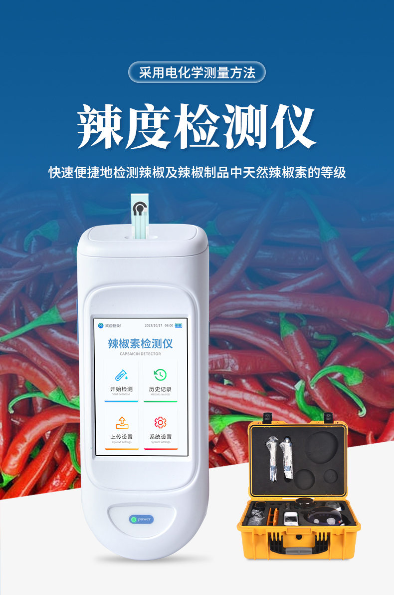 手持式辣度檢測儀采用電化學(xué)測量方法,可快速、便捷地檢測各種辣椒及辣椒制品中的天然辣椒素的等級(jí),適用于干辣椒、鮮辣椒、辣椒粉等天然辣椒及其制品的快速檢測。