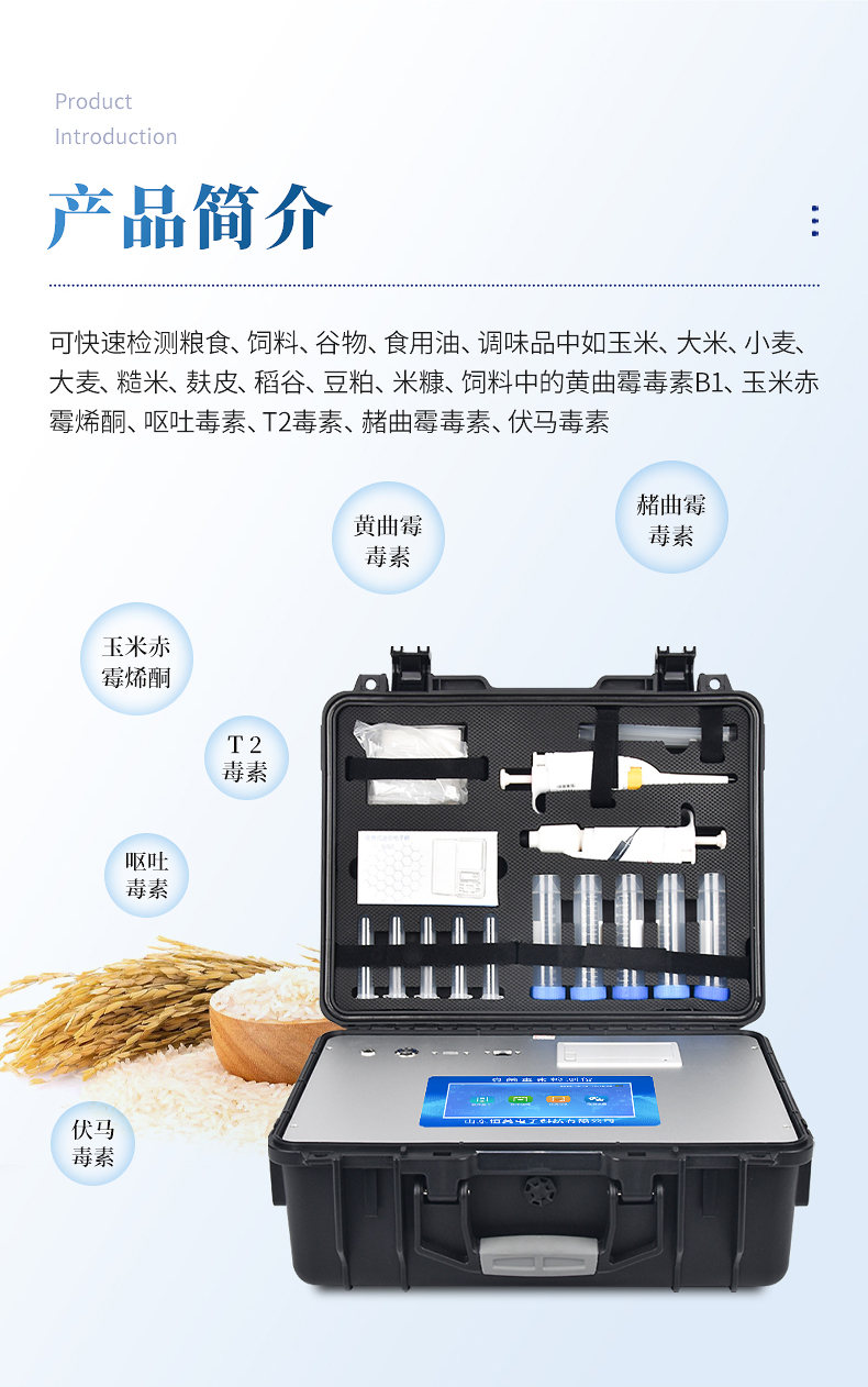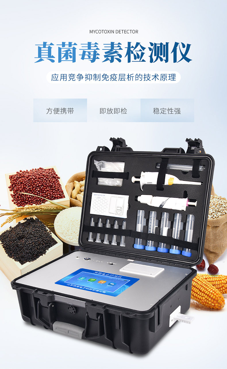 真菌毒素快速檢測(cè)儀應(yīng)用競(jìng)爭(zhēng)抑制免疫層析的技術(shù)原理,通過(guò)就是通過(guò)待檢測(cè)物與抗體結(jié)合的方法,分析待檢樣品中真菌毒素殘留。可快速檢測(cè)糧食、飼料、谷物、食用油、調(diào)味品中如玉米、大米、小麥、大麥、糙米、麩皮、稻谷、豆粕、米糠、飼料中的黃曲霉毒素B1、玉米赤霉烯酮、嘔吐毒素、T2毒素、赭曲霉毒素、伏馬毒素。