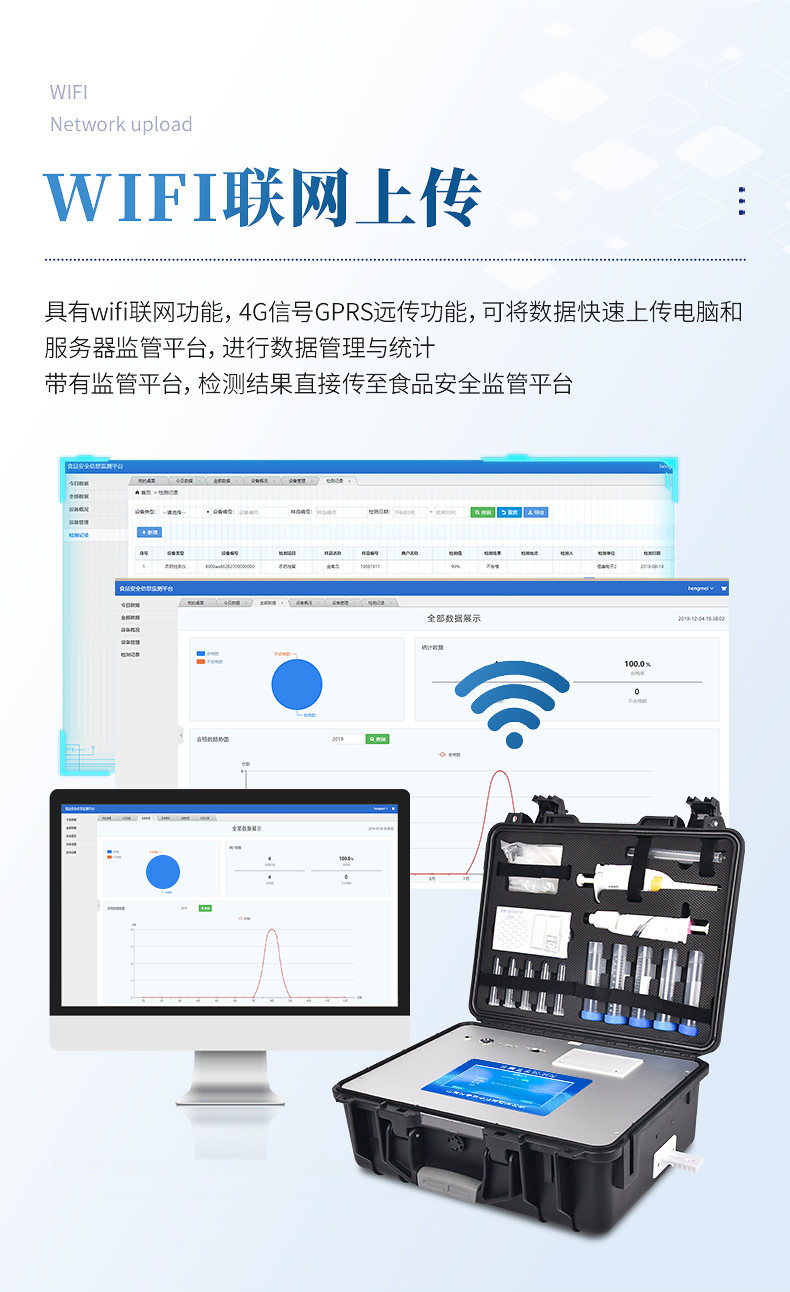 9、儀器帶有監(jiān)管平臺(tái),數(shù)據(jù)可局域網(wǎng)和互聯(lián)網(wǎng)數(shù)據(jù)上傳,檢測(cè)結(jié)果直接傳至食品安全監(jiān)管平臺(tái)。進(jìn)行區(qū)域食品安全監(jiān)管及大數(shù)據(jù)分析處理與數(shù)據(jù)統(tǒng)計(jì),檢測(cè)區(qū)域食品安全長(zhǎng)短期動(dòng)態(tài),達(dá)到食品安全問(wèn)題預(yù)估、預(yù)警。