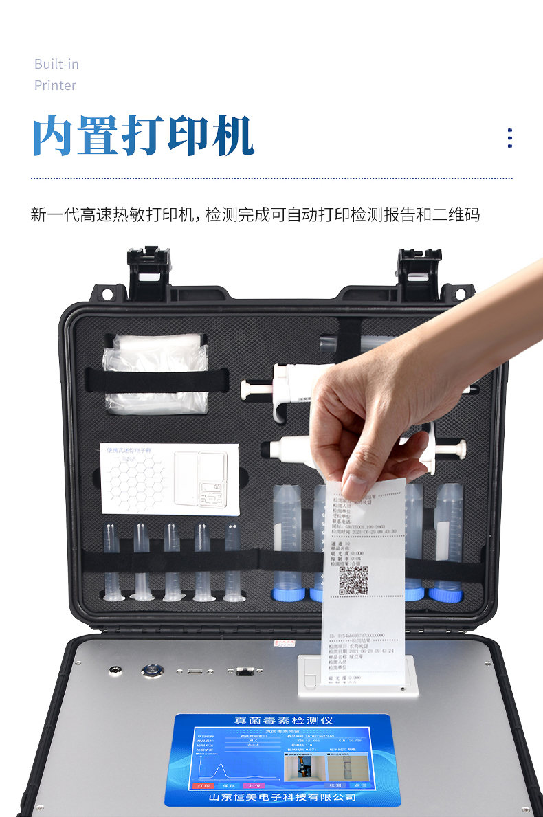 8、新一代高速熱敏打印機(jī),檢測(cè)完成可自動(dòng)打印檢測(cè)報(bào)告和二維碼。打印報(bào)告包含被測(cè)物質(zhì)、合格不合格、檢測(cè)單位、被檢查單位、檢驗(yàn)員、檢測(cè)時(shí)間。