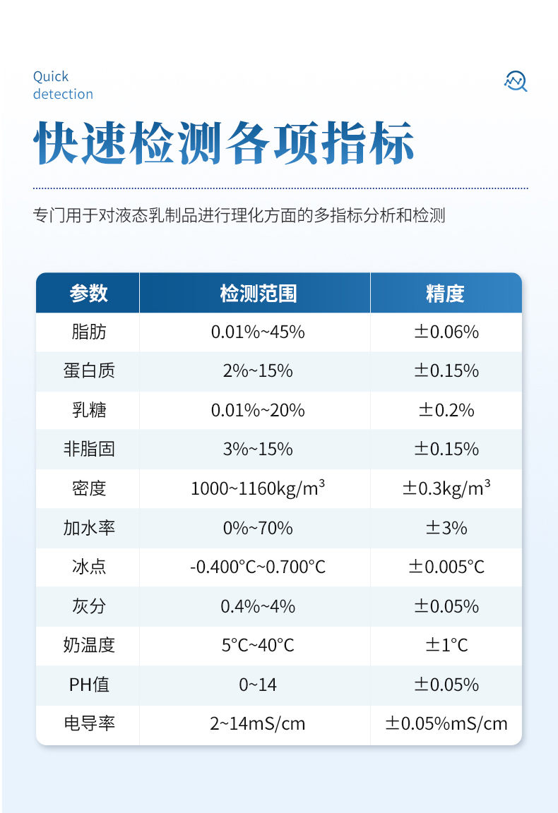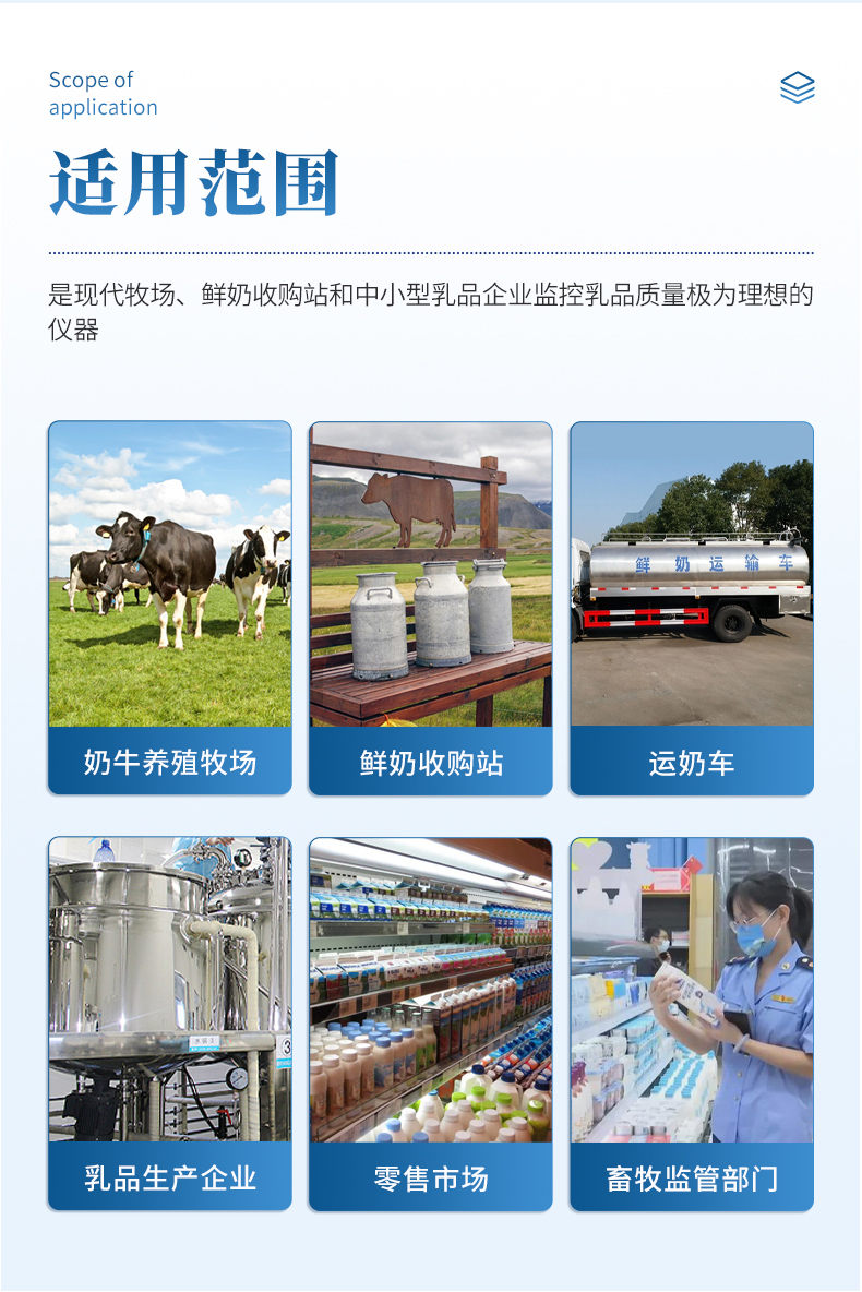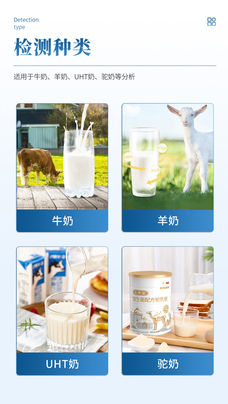 該儀器主要用于乳制品中脂肪,蛋白質(zhì)、乳糖、非脂固形物、密度、摻水率、冰點(diǎn)、灰份、溫度的測(cè)定,適用于牛奶、羊奶、UHT奶等分析,是現(xiàn)代牧場(chǎng)、鮮奶收購(gòu)站和中小型乳品企業(yè)監(jiān)控乳品質(zhì)量極為理想的儀器。