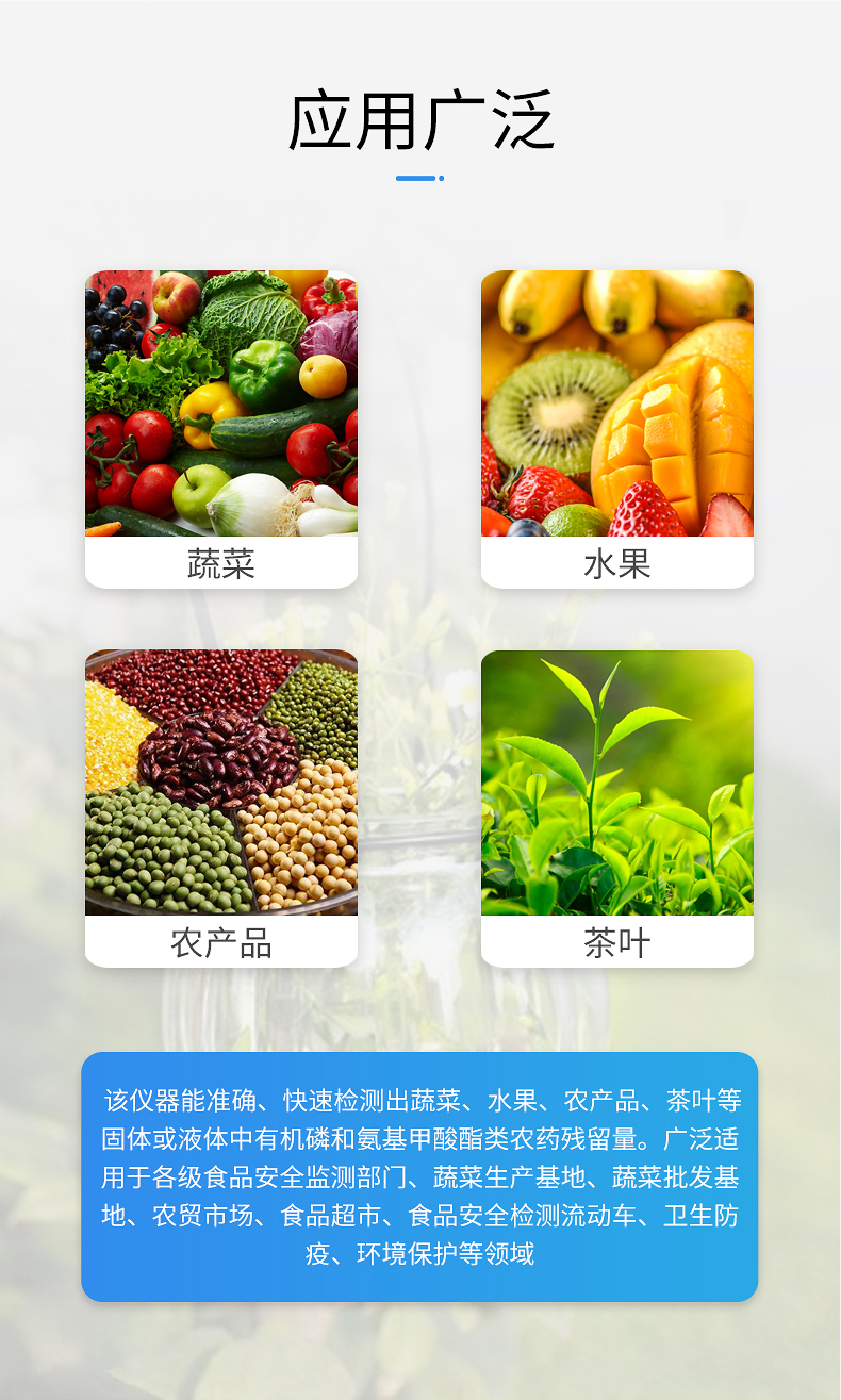 全自動農(nóng)藥殘留快速檢測儀可以廣泛應(yīng)用于產(chǎn)品質(zhì)量監(jiān)督檢驗、衛(wèi)生防疫、環(huán)境保護、工商管理、蔬菜批發(fā)市場、蔬菜生產(chǎn)基地、超市、商場、農(nóng)藥殘留監(jiān)測系統(tǒng)等部門的蔬菜和水果中的農(nóng)藥殘留檢測。