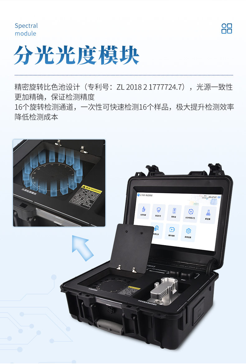 4、★分光光度模塊,16個(gè)旋轉(zhuǎn)檢測(cè)通道,一次性可快速檢測(cè)16個(gè)樣品,極大提升檢測(cè)效率,降低檢測(cè)成本。