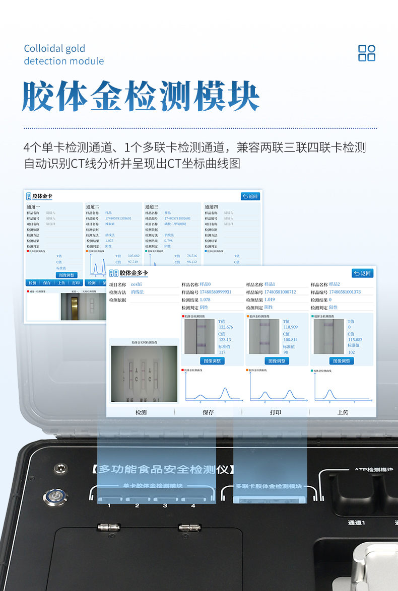 5、★膠體金檢測(cè)模塊,4個(gè)單卡檢測(cè)通道、1個(gè)多聯(lián)卡檢測(cè)通道,兼容兩聯(lián)三聯(lián)四聯(lián)卡檢測(cè),自動(dòng)識(shí)別CT線分析并呈現(xiàn)出CT坐標(biāo)曲線圖。