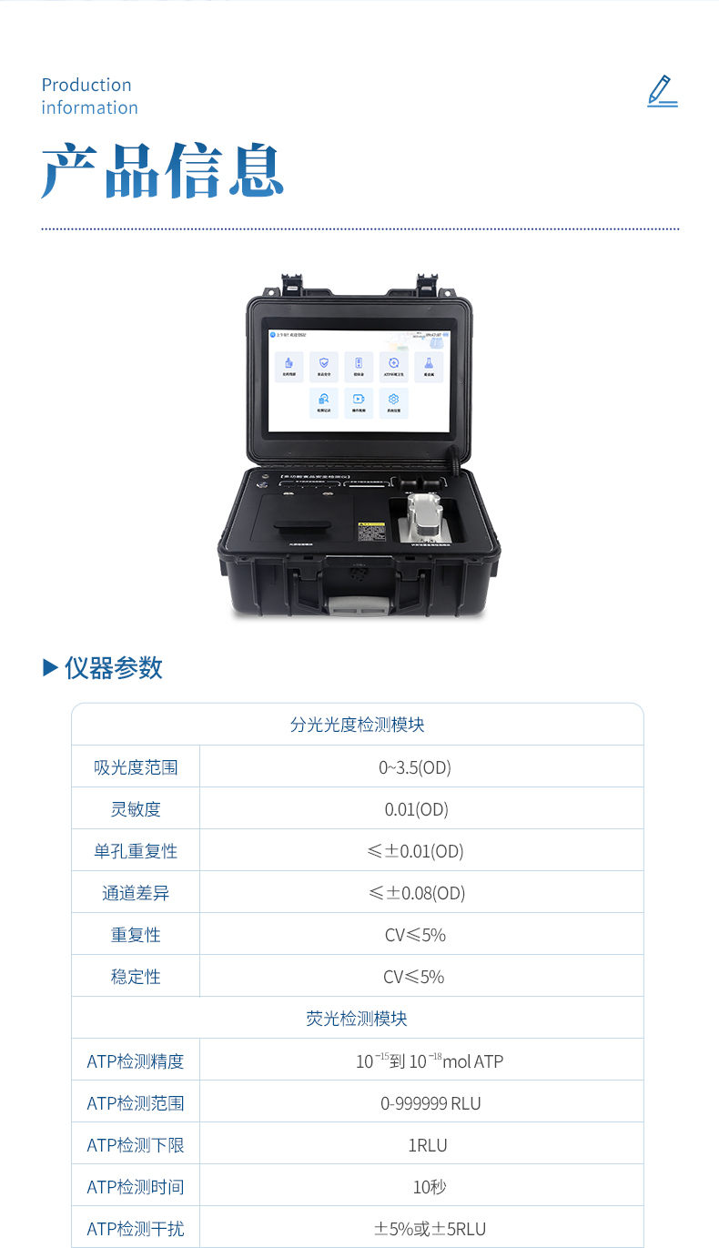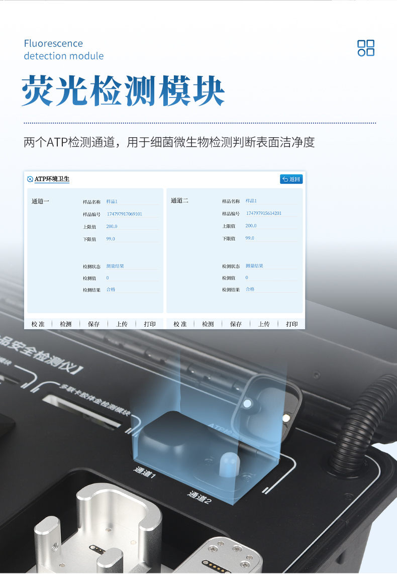 6、★熒光檢測(cè)模塊,2個(gè)ATP檢測(cè)通道,用于細(xì)菌微生物檢測(cè)判斷表面潔凈度。