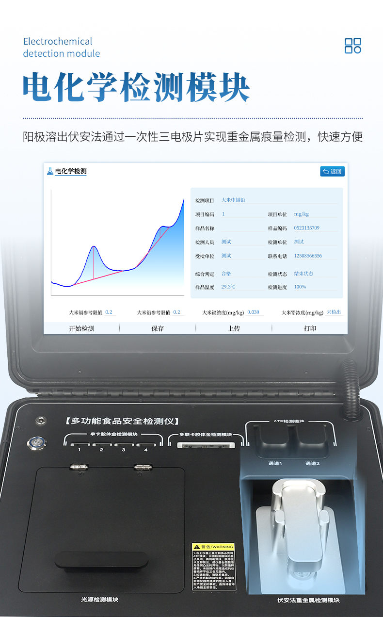 7、★電化學(xué)檢測(cè)模塊,陽(yáng)極溶出伏安法通過(guò)一次性三電極片實(shí)現(xiàn)重金屬痕量檢測(cè),快速方便。