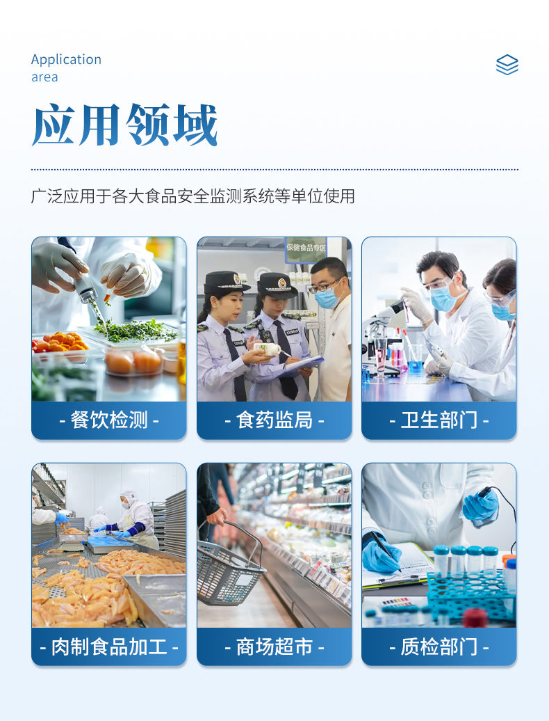 廣泛應用于餐飲檢測、食藥監(jiān)局、衛(wèi)生部門、肉制食品深加工企業(yè)、商場超市、質量監(jiān)督檢驗、工商管理各大食品安全監(jiān)測系統(tǒng)等單位使用。