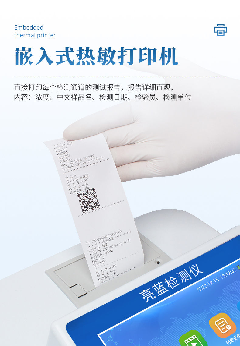 ●帶有嵌入式微型熱敏打印機,直接打印每個檢測通道的測試報告,報告詳細直觀,內容:濃度、中文樣品名、檢測日期、檢驗員、檢測單位