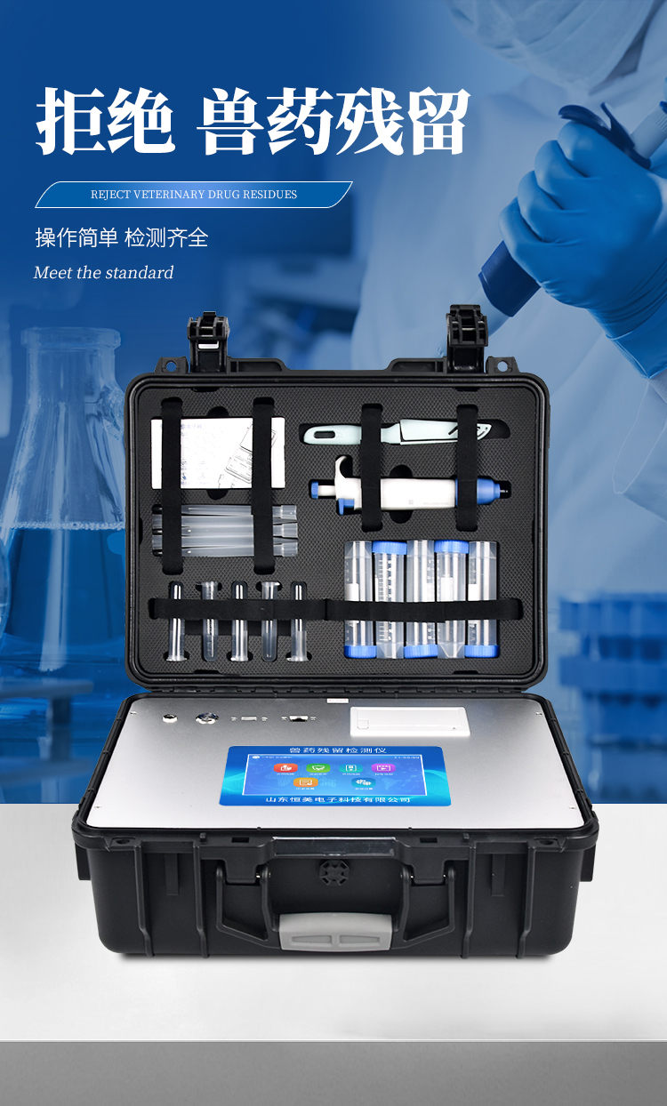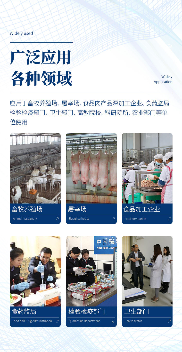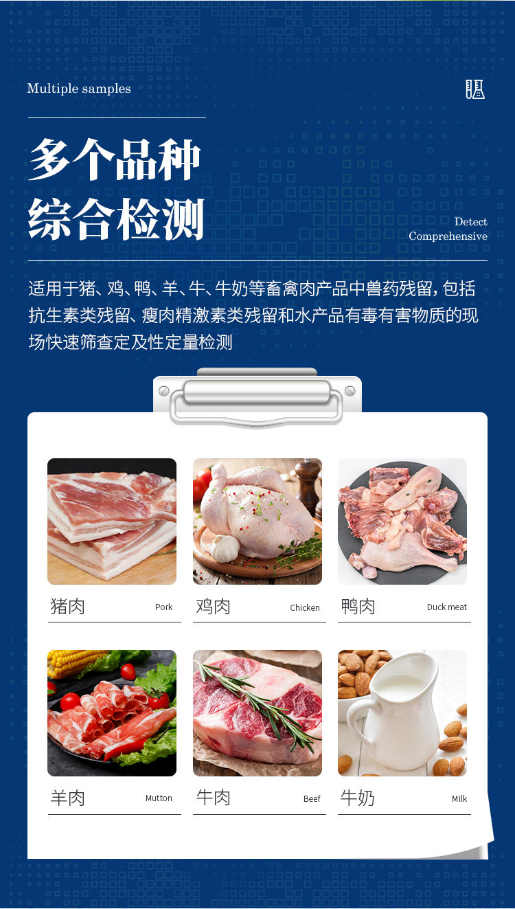 獸藥殘留檢測儀適用于豬、雞、鴨、羊、牛、牛奶等畜禽肉產(chǎn)品中獸藥殘留,包括抗生素類殘留、瘦肉精激素類殘留和水產(chǎn)品有毒有害物質(zhì)的現(xiàn)場快速篩查定及性定量檢測。