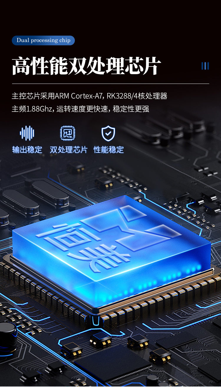 1、主控芯片采用ARM Cortex-A7,RK3288/4核處理器,主頻1.88Ghz,運轉(zhuǎn)速度更快速,穩(wěn)定性更強。