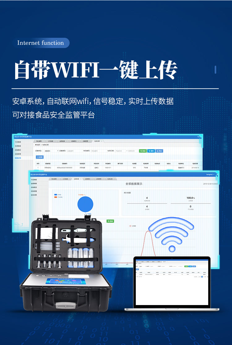 4、儀器帶有監(jiān)管平臺,數(shù)據(jù)可局域網(wǎng)和互聯(lián)網(wǎng)數(shù)據(jù)上傳,檢測結(jié)果直接傳至食品安全監(jiān)管平臺。進行區(qū)域食品安全監(jiān)管及大數(shù)據(jù)分析處理與數(shù)據(jù)統(tǒng)計,檢測區(qū)域食品安全長短期動態(tài),達到食品安全問題預(yù)估、預(yù)警