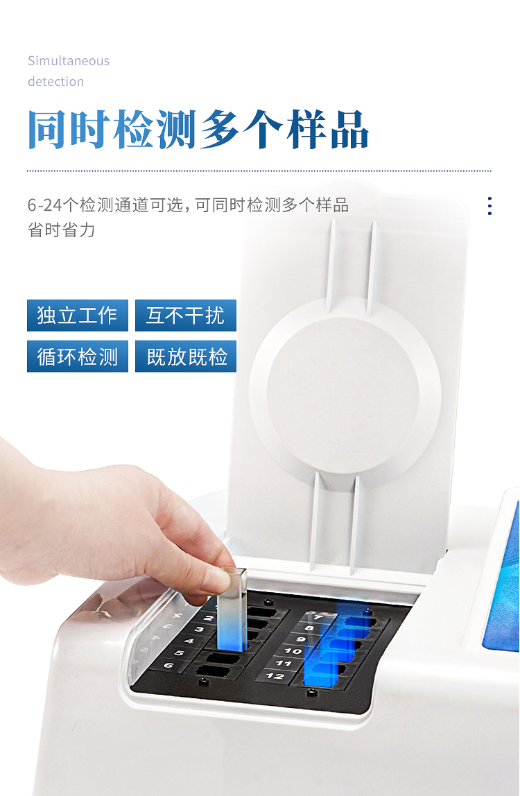 4、檢測通道:16個檢測通道,可以同時測試多個樣品,循環(huán)檢測,即放即檢,每個樣品由程序控制分別獨(dú)立工作,不會互相干擾。