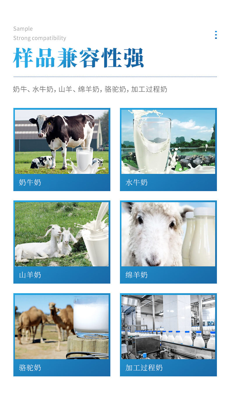 樣品兼容性強(qiáng):奶牛、水牛奶,山羊、綿羊奶,駱駝奶,加工過程奶。