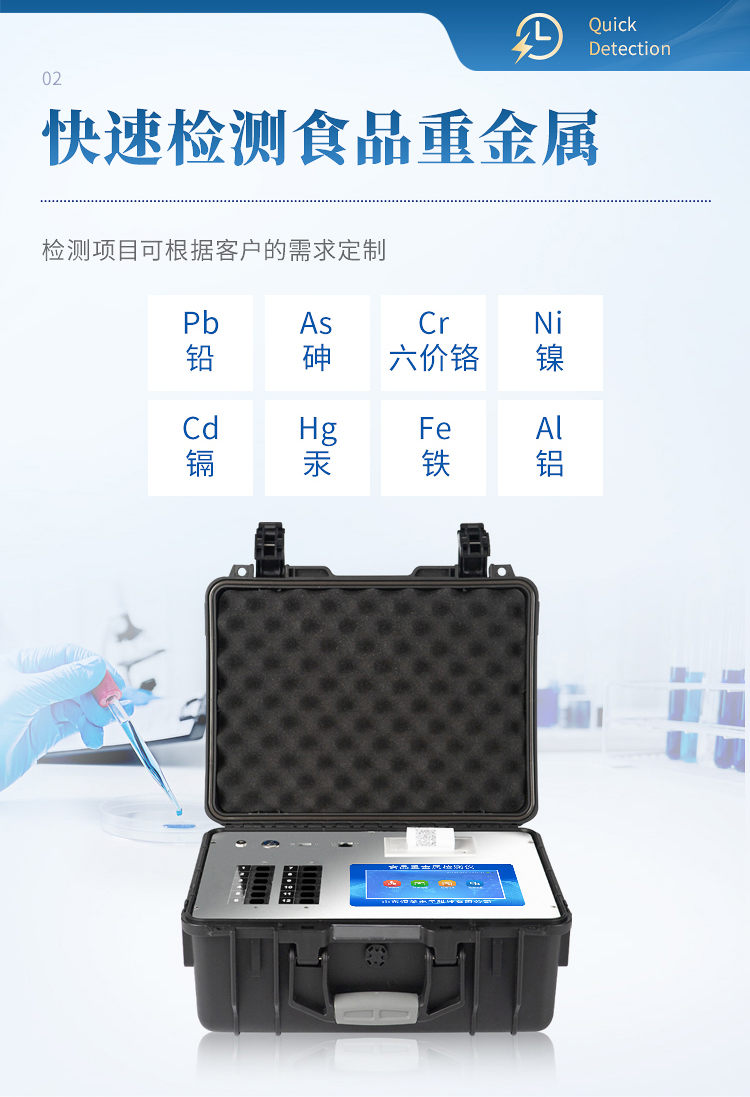 BZ01重金屬檢測儀可廣泛應(yīng)用于大米、糧谷、果品、蔬菜、藥材、水質(zhì)、水產(chǎn)品中重金屬鉛、鎘、六價鉻、汞、砷、鐵、鎳、鋁(任選1項)的快速檢測,檢測項目可根據(jù)客戶的需求定制。