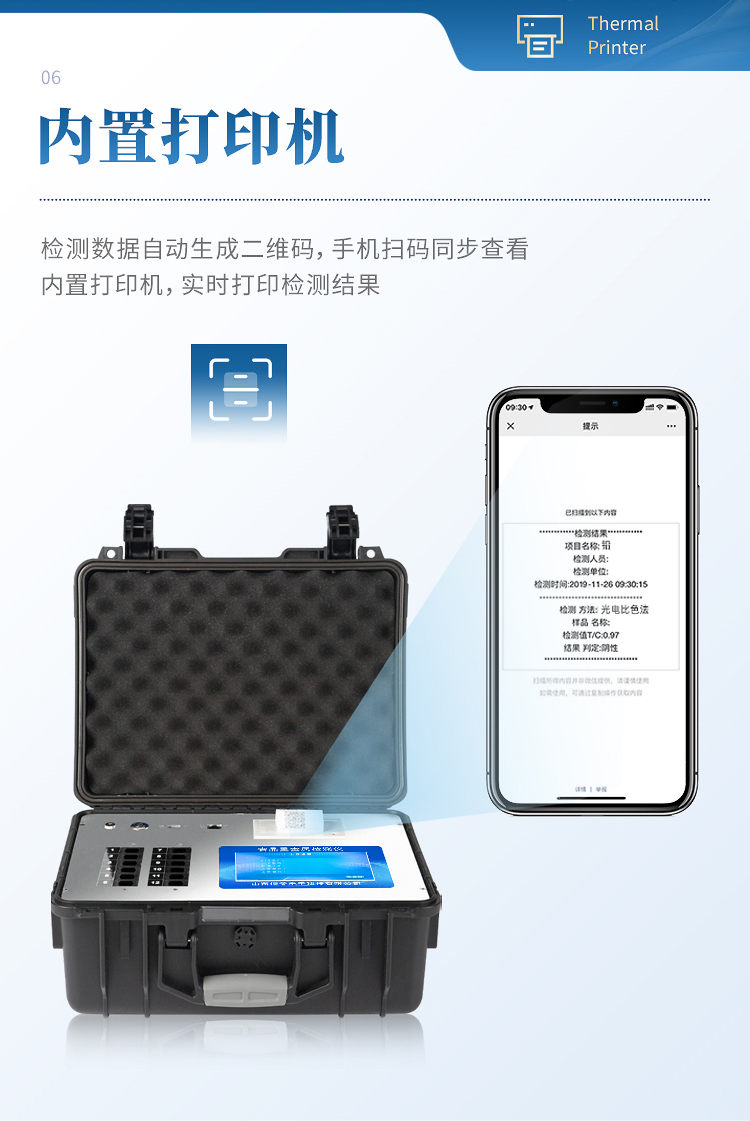 7、高速熱敏打印機,實時打印檢測結(jié)果。內(nèi)置大容量電池,便于現(xiàn)場執(zhí)法檢測。